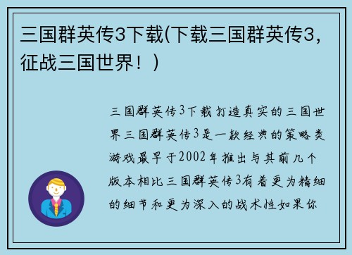 三国群英传3下载(下载三国群英传3,征战三国世界!)