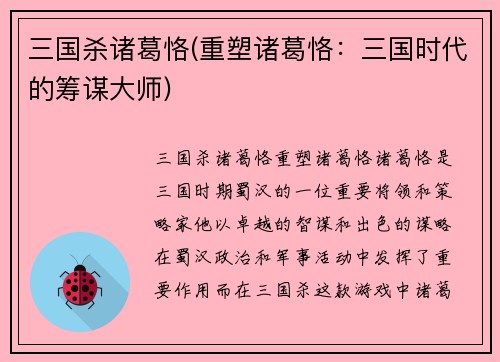 三国杀诸葛恪(重塑诸葛恪:三国时代的筹谋大师)
