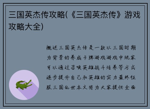 三国英杰传攻略(《三国英杰传》游戏攻略大全)